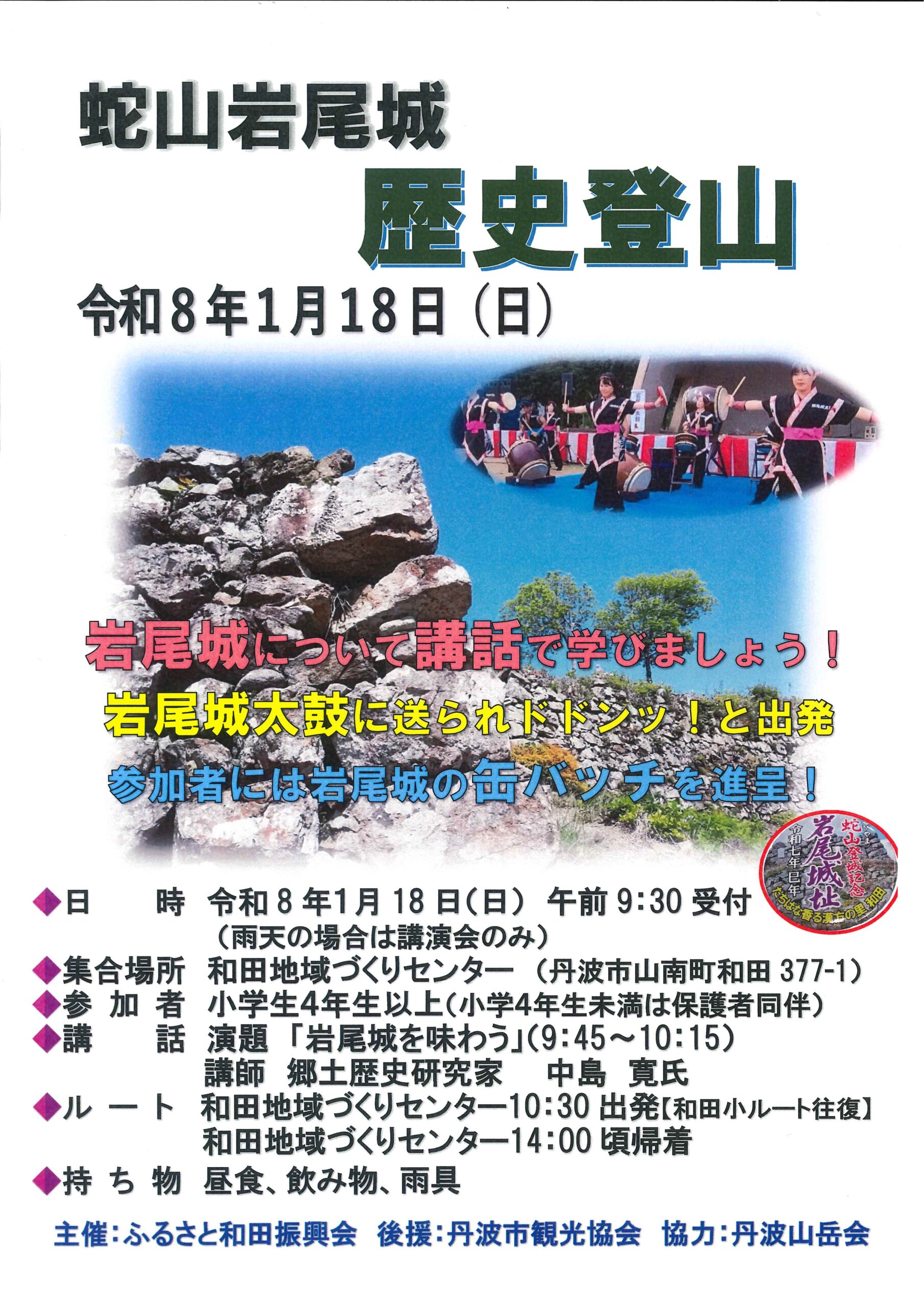 トップページ 2024.03.052026.01.15 今年もやります!恒例の岩尾城歴史登山!郷土歴史研究家の中島寛氏の講和で岩尾城について学んだ後、皆で岩尾城に登りましょう!参加者全員に記念缶バッジ差し上げます。ぜひご参加ください! 和田地域づくりセンターは外壁塗装工事が終了しました。東京在住アーティスト、オギワラ・シンヤさんによる巨大壁画も完成!蛇山と岩尾城、そしてゆかいな仲間たちが集まる楽しい絵柄が印象的。和田の新しい名所となることを期待します。 会場使用料 コピー・印刷代 グラウンドゴルフセット、モルックセットの貸し出しあります!無料です!地域づくりセンター2階で囲碁ボールもお楽しみいただけます。お一人様50円です。 兵庫県丹波市山南町の和田地区は、江戸時代から薬草の生育地として知られており、漢方の里と呼ばれています。今も当帰や黄連やセネガなどの栽培が盛んです。かつての薬草王国で健康と癒しを体験してみませんか。 薬草の保管に使用されていた『百味箪笥(ひゃくみだんす)』です。地域づくりセンターのロビーに置いています。